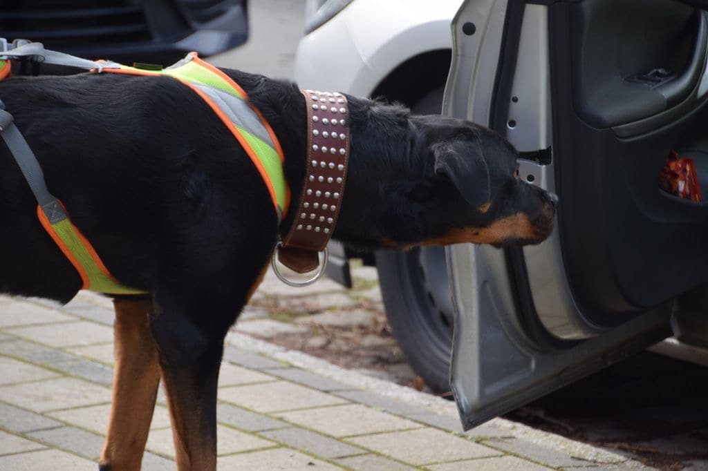 3 Geruchsartikel (GA’s) mussten ausgearbeitet werden. Zwei GA’s davon waren ein „Negativ Scent Identification“ (NSI) und lediglich ein GA führte zum Trail. Es gab drei Gebäudeeingänge, die ausgearbeitet werden mussten. Dies ist einer der wichtigsten Aufgaben eines Mantrailers. Die korrekte Anzeige entscheidet, ob eine Suche überhaupt beginnt oder die Person sich niemals am Ort aufgehalten hat.